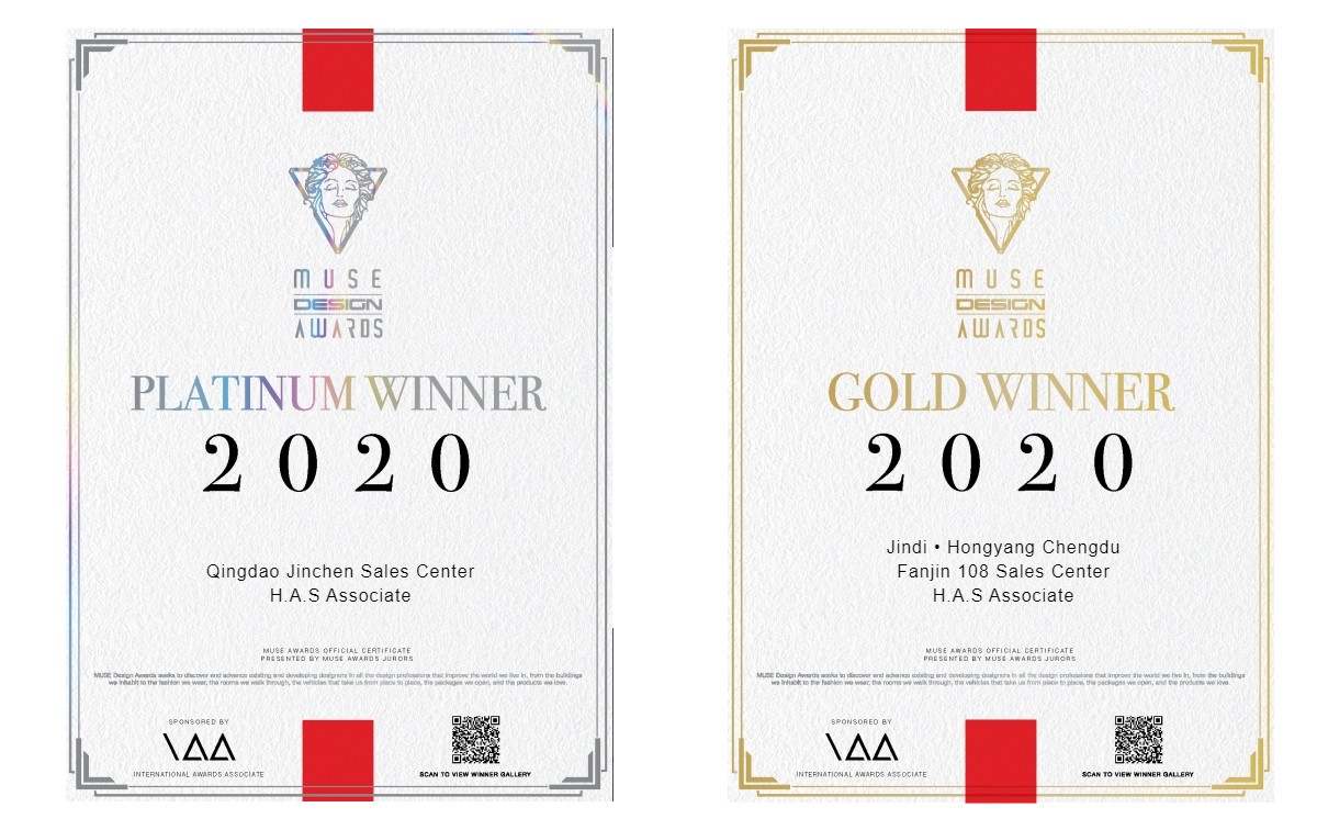可喜的是,在本届缪斯设计奖获奖名单中,禾悉设计两项参赛作品脱颖而出,分别获得: 青岛金地锦宸售楼处 斩获2020缪斯设计大奖最高奖项 铂金奖,金地·弘阳成都梵锦108销售中心 斩获 金奖。